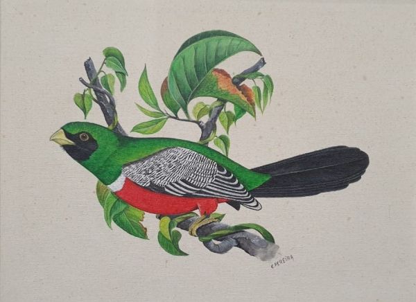 Adquiri uma de suas obras, o pássaro “Surucuá de barriga-vermelha”, e dos pesquisadores que visitam o ICBS e se interessam pelo quadro, surgem logo rasgados elogios ao artista.