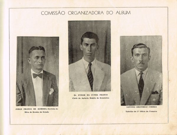 A comissão organizadora do álbum era composta pelo tabelião do 2ª ofício da Comarca, Santino Sirotheau Corrêa; o escrivão da Mesa de Rendas do Estado, Jorge Franco de Almeida; e o chefe da Agência Modelo de Estatística, meu saudoso amigo Eymar da Cunha Franco que, com toda certeza, foi quem fez a pesquisa para compor os dados gerais do município, escreveu o texto e editou o álbum.